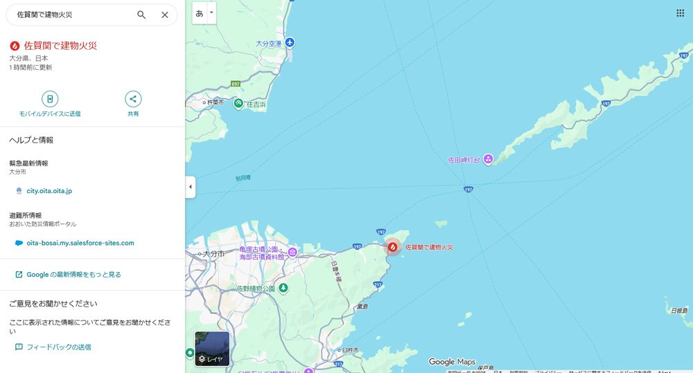「佐賀関で建物火災」と表示されていますが、これは私が入力したものではなく、google側が設定をかけ、表示されている情報です。